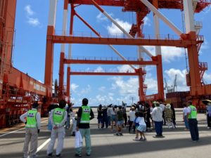 普段は入ることのできない港内で、間近に大きなコンテナ船や